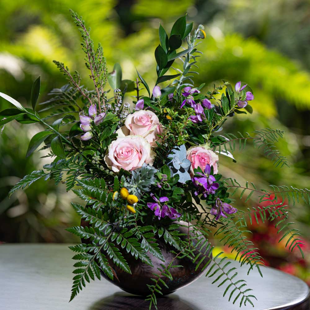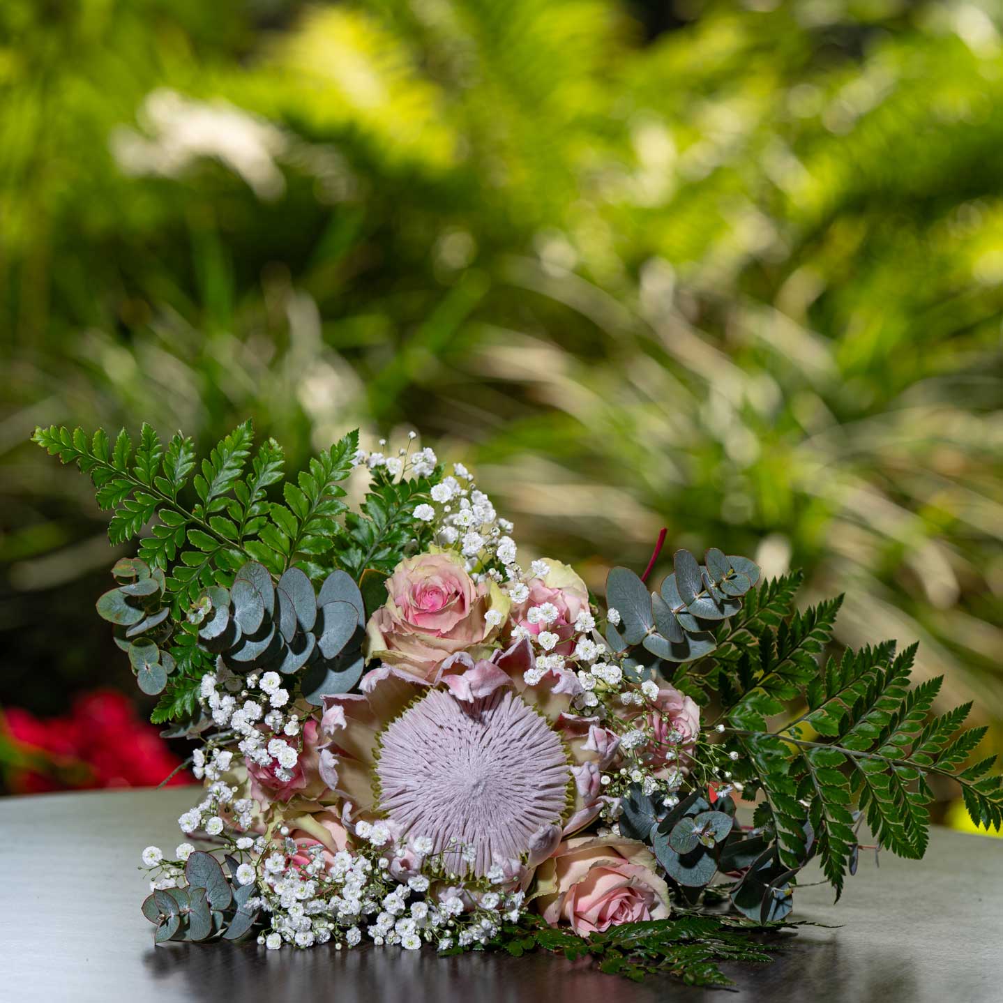 King/Cynaroides Protea with Hybrid Tea Rose, Rekoala, Klapper Stems, Pollichia, Rumohra Fern and Mikado Seed.