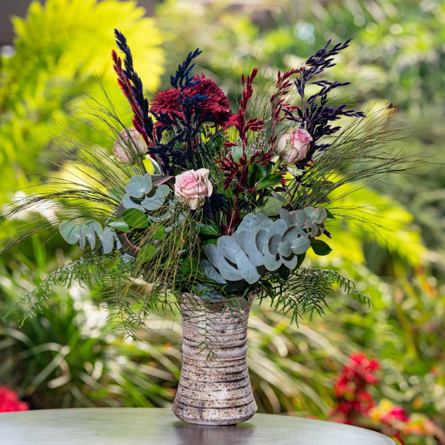 Roses with Patty Pomegranete mum, Pennygum Eucalyptus, Fynbos, Rekoala, Ruscus, Klapper, Honye Bush