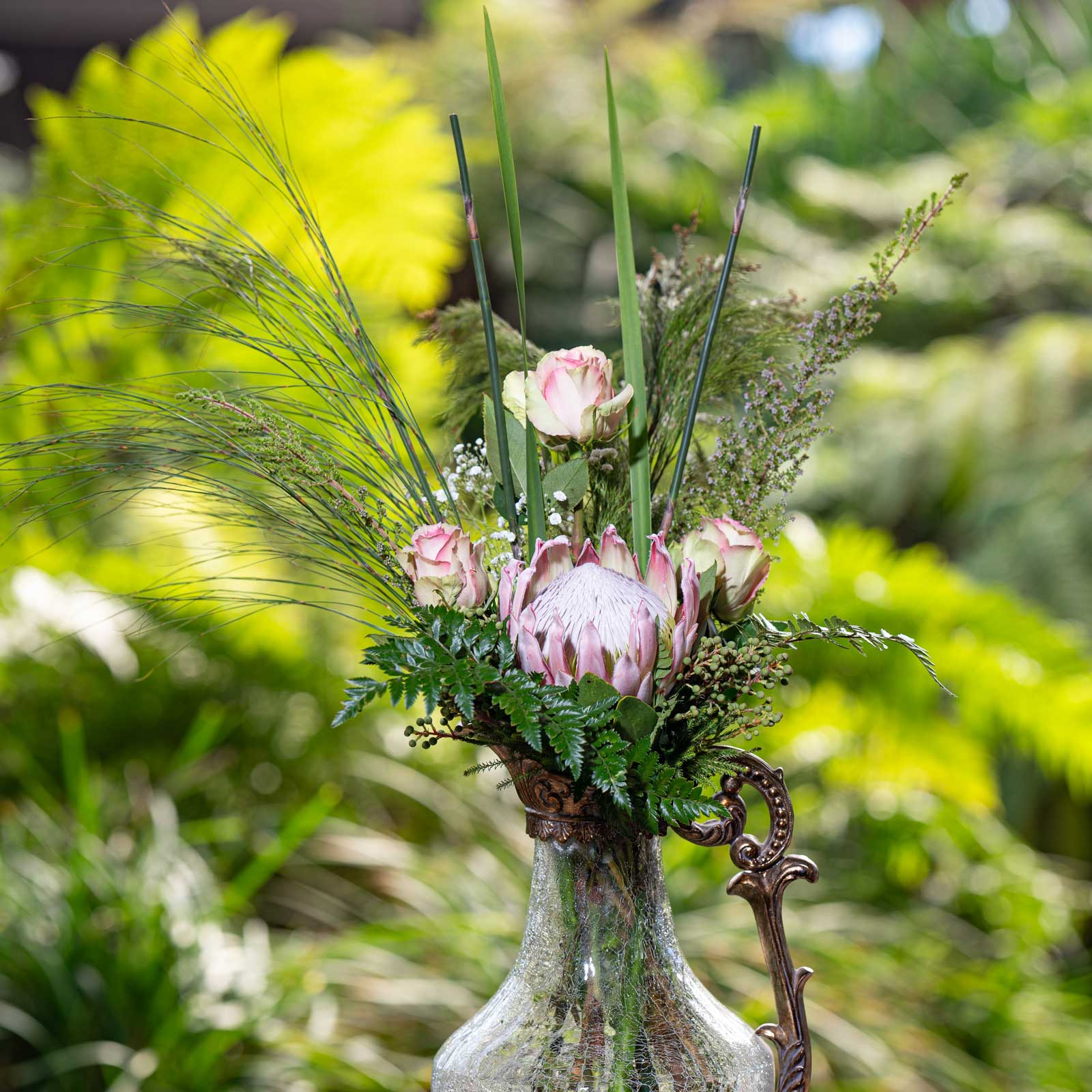 Sylvia Protea with Hybrid Tea Rose, Mikado Seed, Minora, Steppen Grass, Pennygum Eucalyptus,Lime Green Flower and Fynbos White Faux.