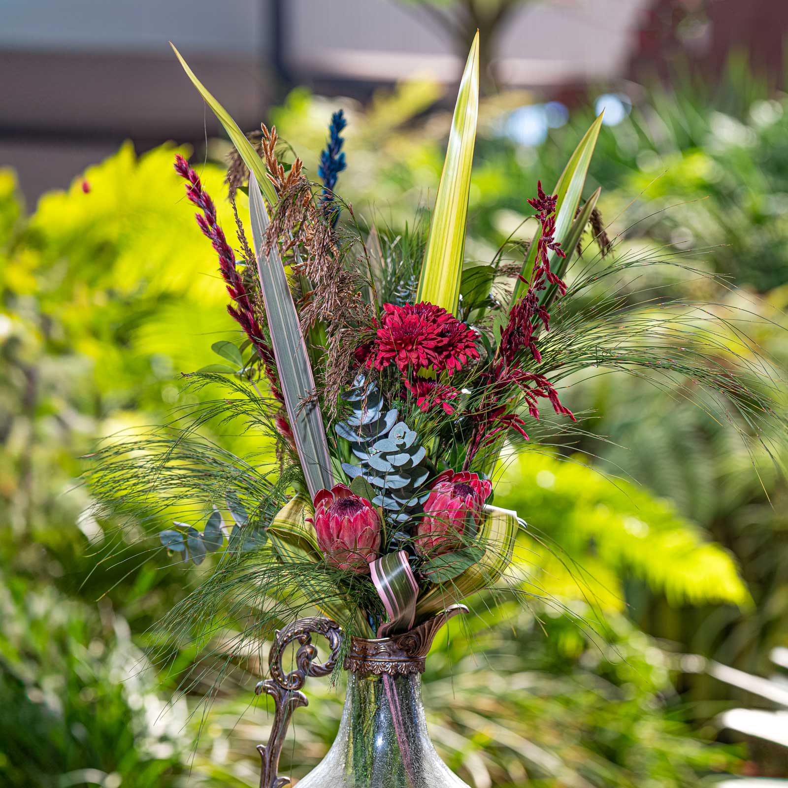 Silvia Protea and Patty Pomegranete mum with Flaxes Pink Stripe,Fynbos, Pennygum Eucalyptus, Rekoala,