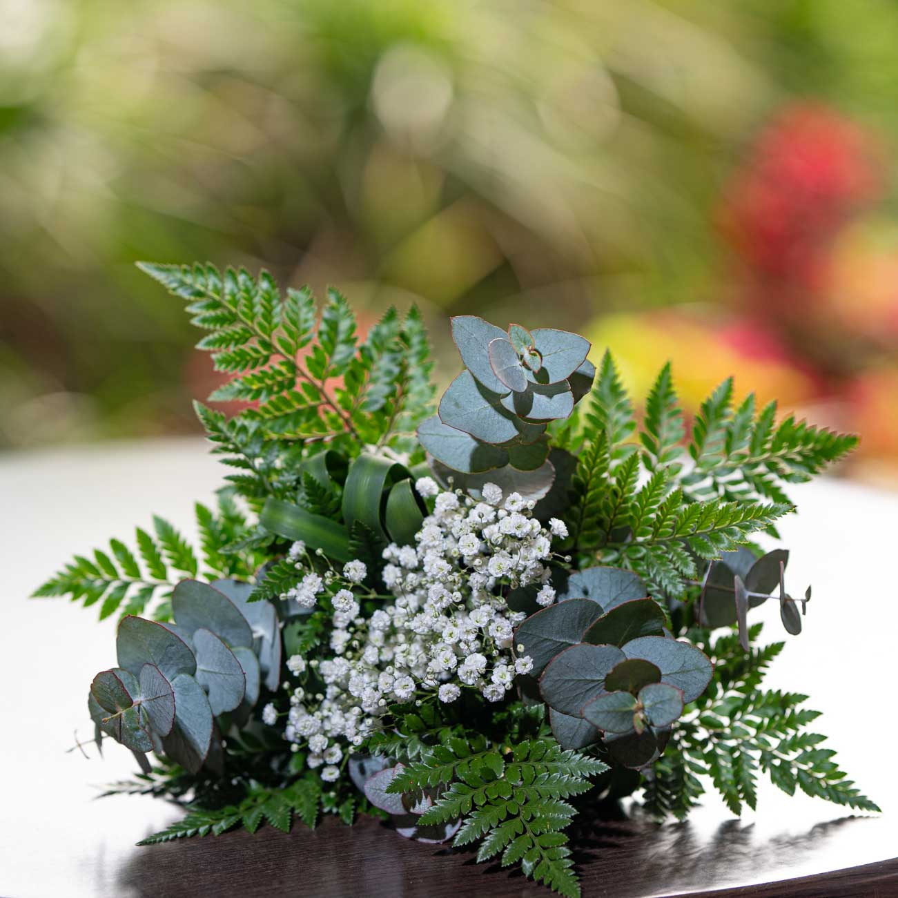 White Faux Baby Breath Fynbos with Pennygum Eucalyptus, Minora Grass, Phormium Green and Phormium Amber.